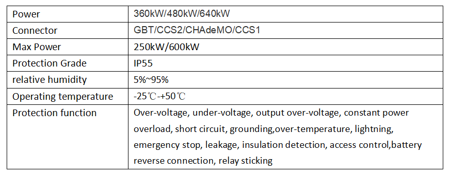 The 360-640KW charging stack adopts modularization systems, which is convenient, simple and efficient in maintenance